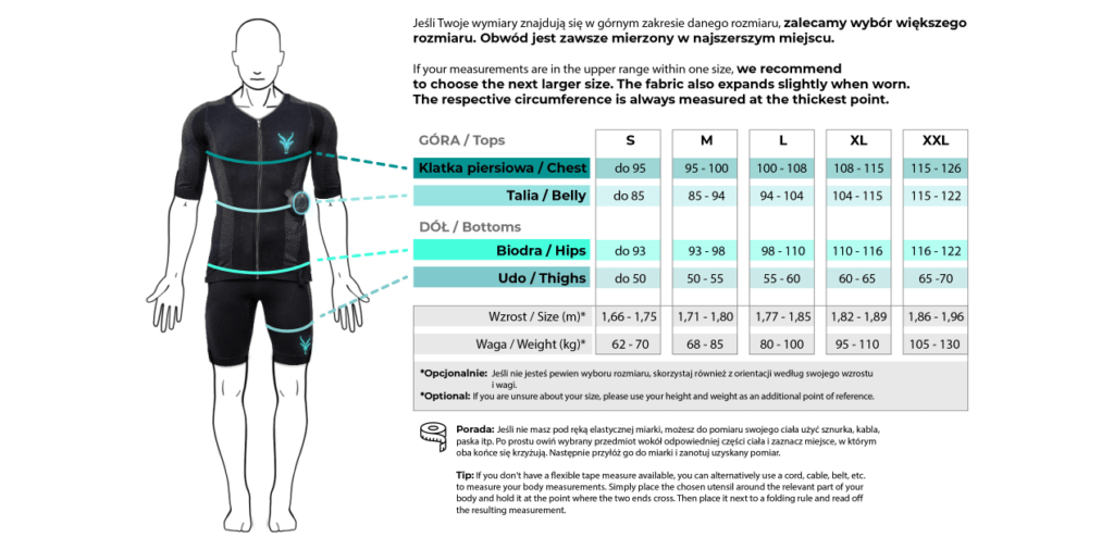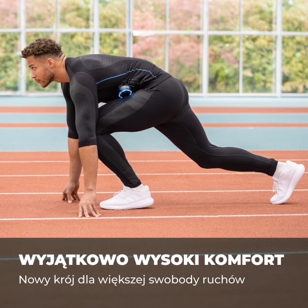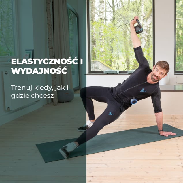 - Kombinezon EMS stworzony z myślą o kompleksowym treningu całego ciała – od ramion po łydki, dostępny teraz także w wersji z legginsami.