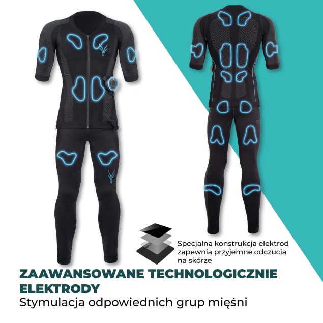 - Elektromagnetyczne impulsy w koszulce aktywują mięśnie brzucha, klatki piersiowej, szyi, pleców i ramion, podczas gdy elektrody w legginsach celują w mięśnie nóg, pośladków oraz łydek.